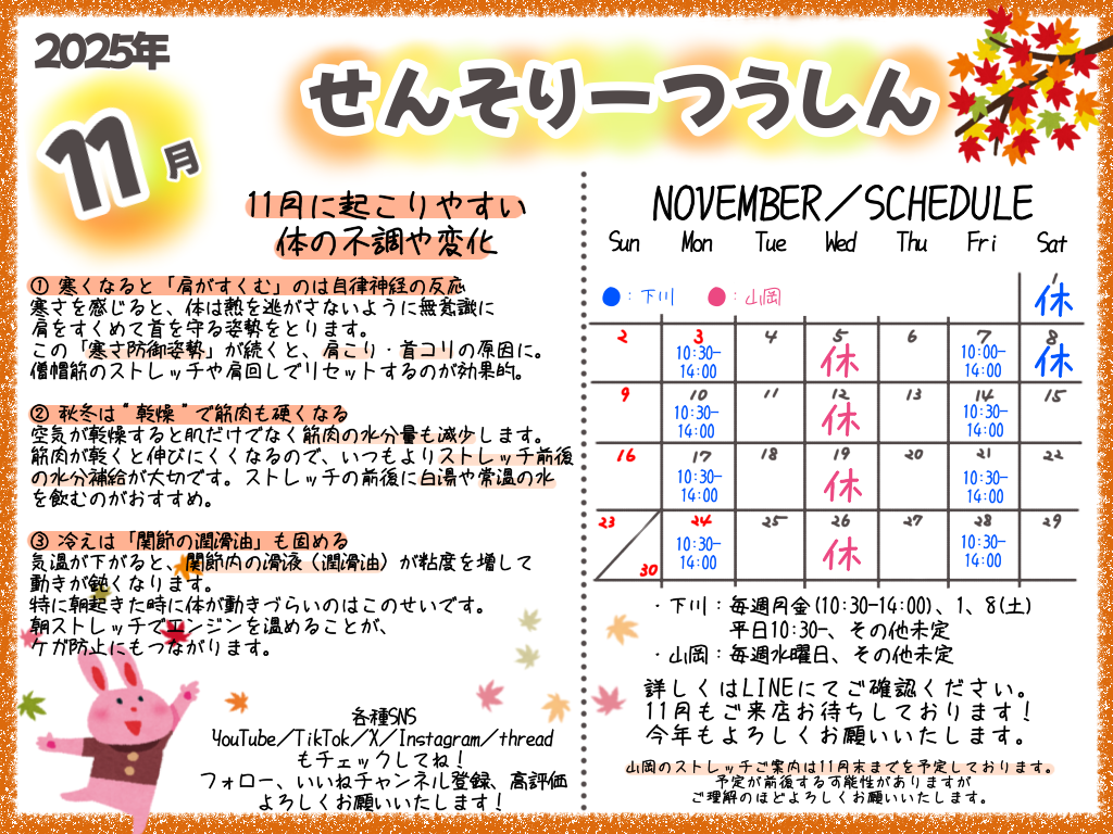 【11月ご予約解禁】 2025.10.27| お知らせ tweet facebook LINE こんにちは! 11月のご予約を解禁しております。 ご連絡が遅くなり申し訳ございません。 画像のものは、当店の公式ラインにて毎月配布している通信になります。 今回特別のこちらでも公開いたします! 毎月の予定から、その月の体に関する豆知識など タメになる情報が、他にもたくさんございます。 是非ご来店予定がない方でもお友達登録していただければなと思いますので 是非この機会に登録よろしくお願いいたします! tweet facebook LINE
